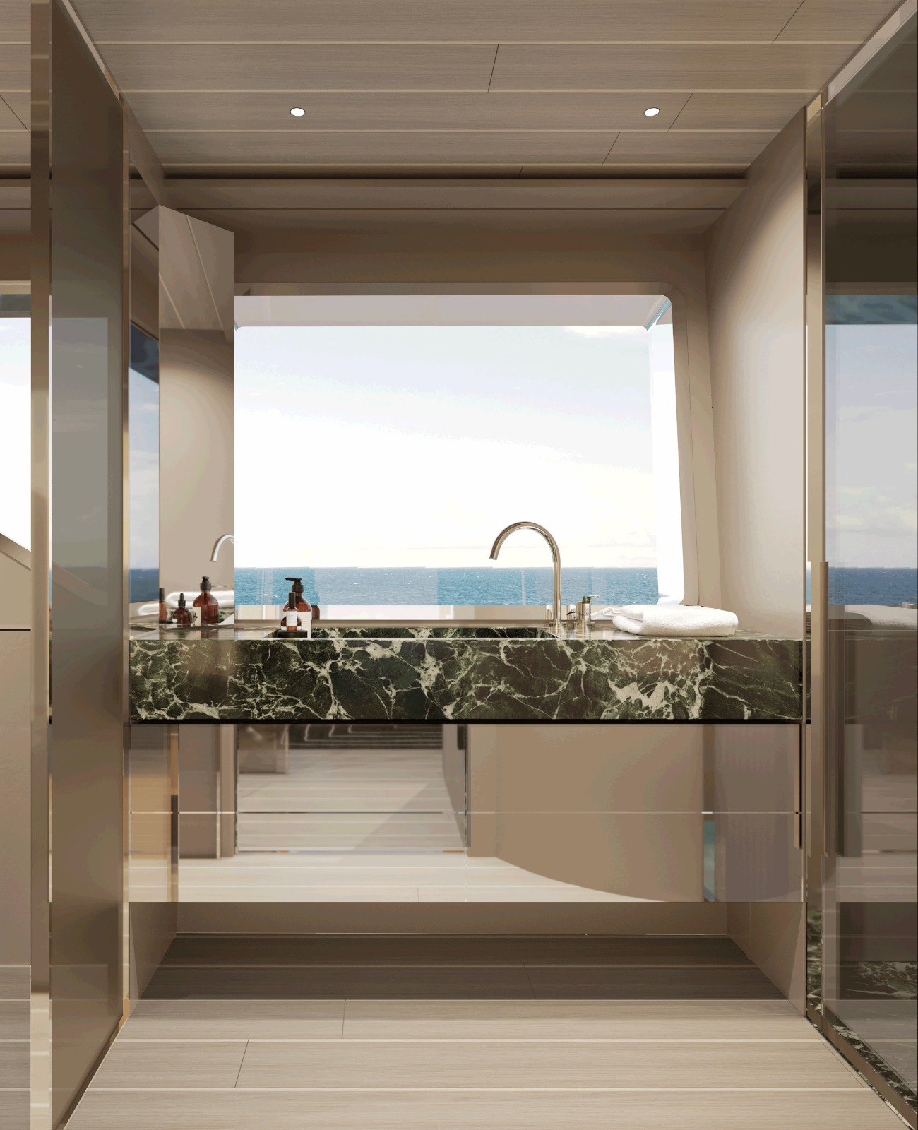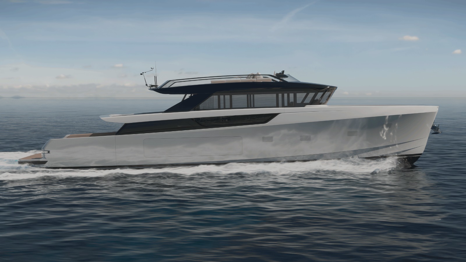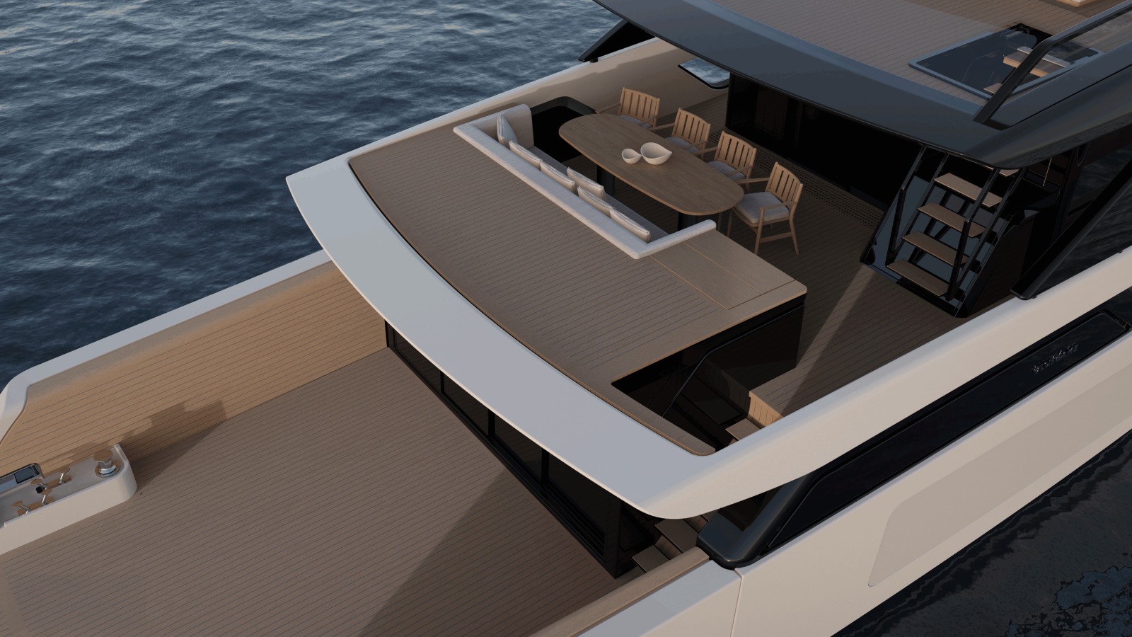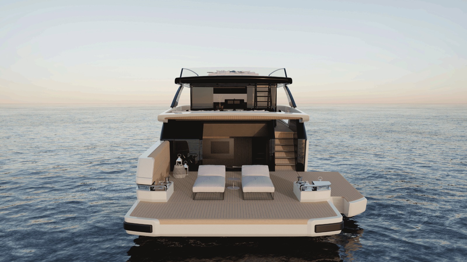 Kıç bölümde yer alan yan açılımlı hidrolik platform, plaj alanını suyun üzerinde geniş bir dinlenme ve sosyalleşme alanına dönüştürür — denizle iç içe, çok yönlü ve davetkâr