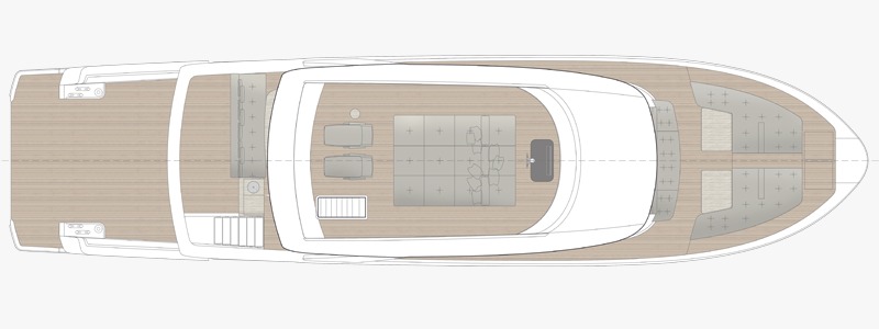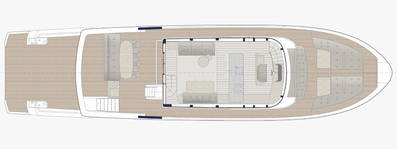 Teknenin etkileyici kıç salon girişi, denizi doğrudan yaşam alanlarının kalbine taşıyarak tekne içi akışı baştan tanımlar ve benzersiz bir deneyim yaratır. Flybridge’e taşınan ve şık bir hardtop ile korunan kumanda merkezi, iç hacmi özgürleştirirken kaptana olağanüstü bir panoramik görüş ve açık seyir hissi sunar