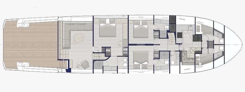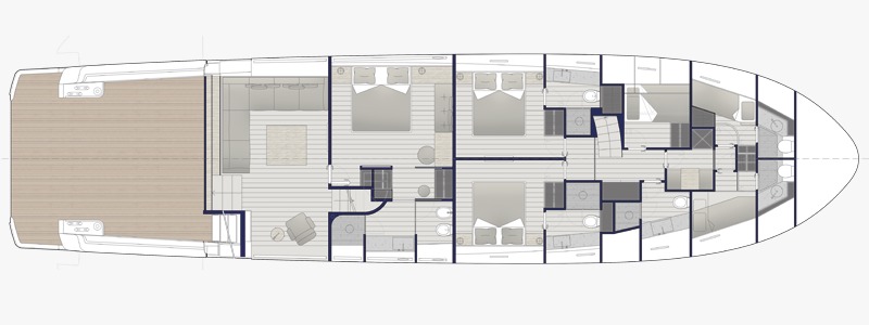 Lüks bir owner’s suite dâhil dört geniş kabin, tüm misafirlere üst düzey konfor ve mahremiyet sağlarken, denizle ve açık alanlarla olan benzersiz bağı korur