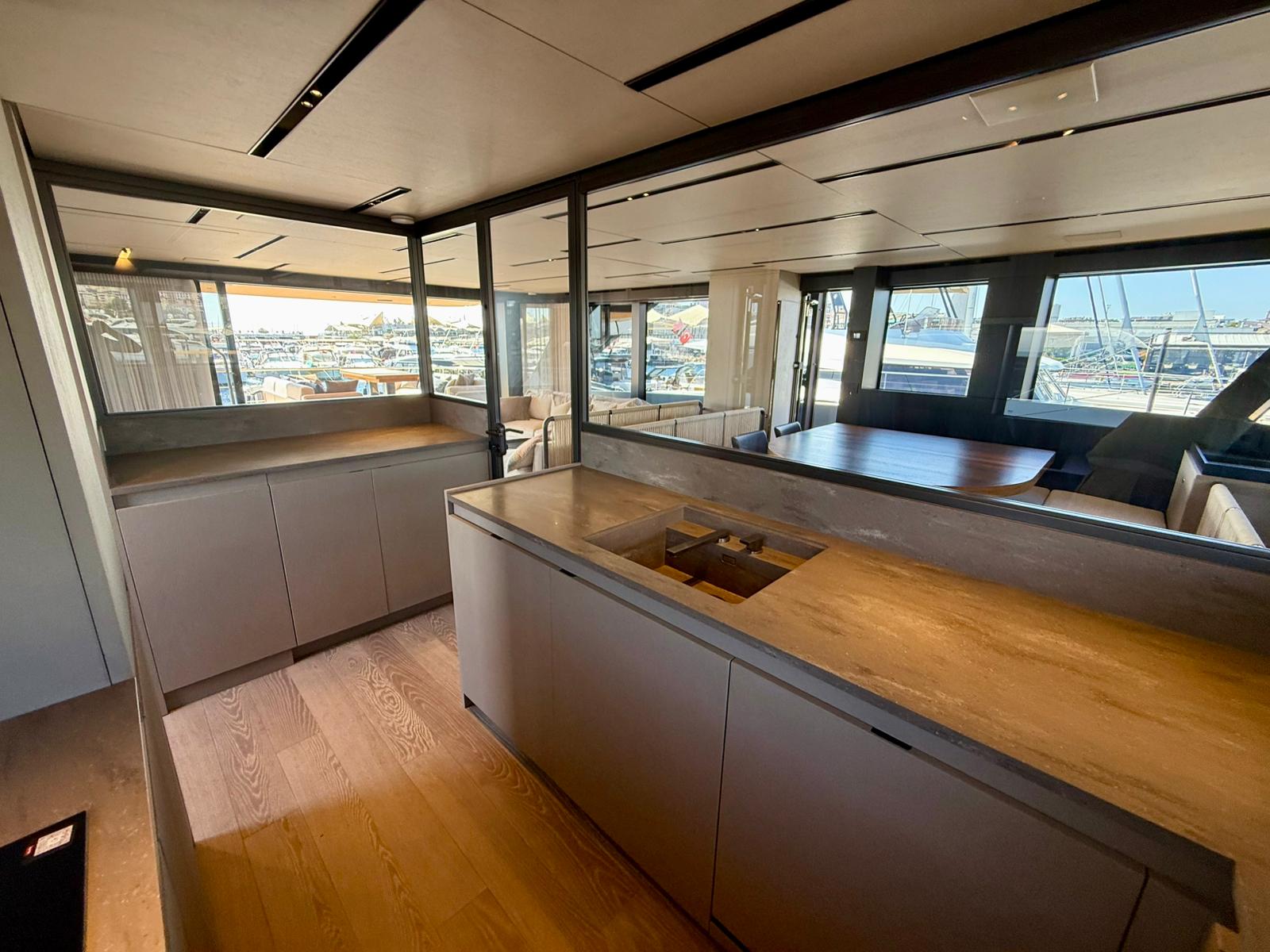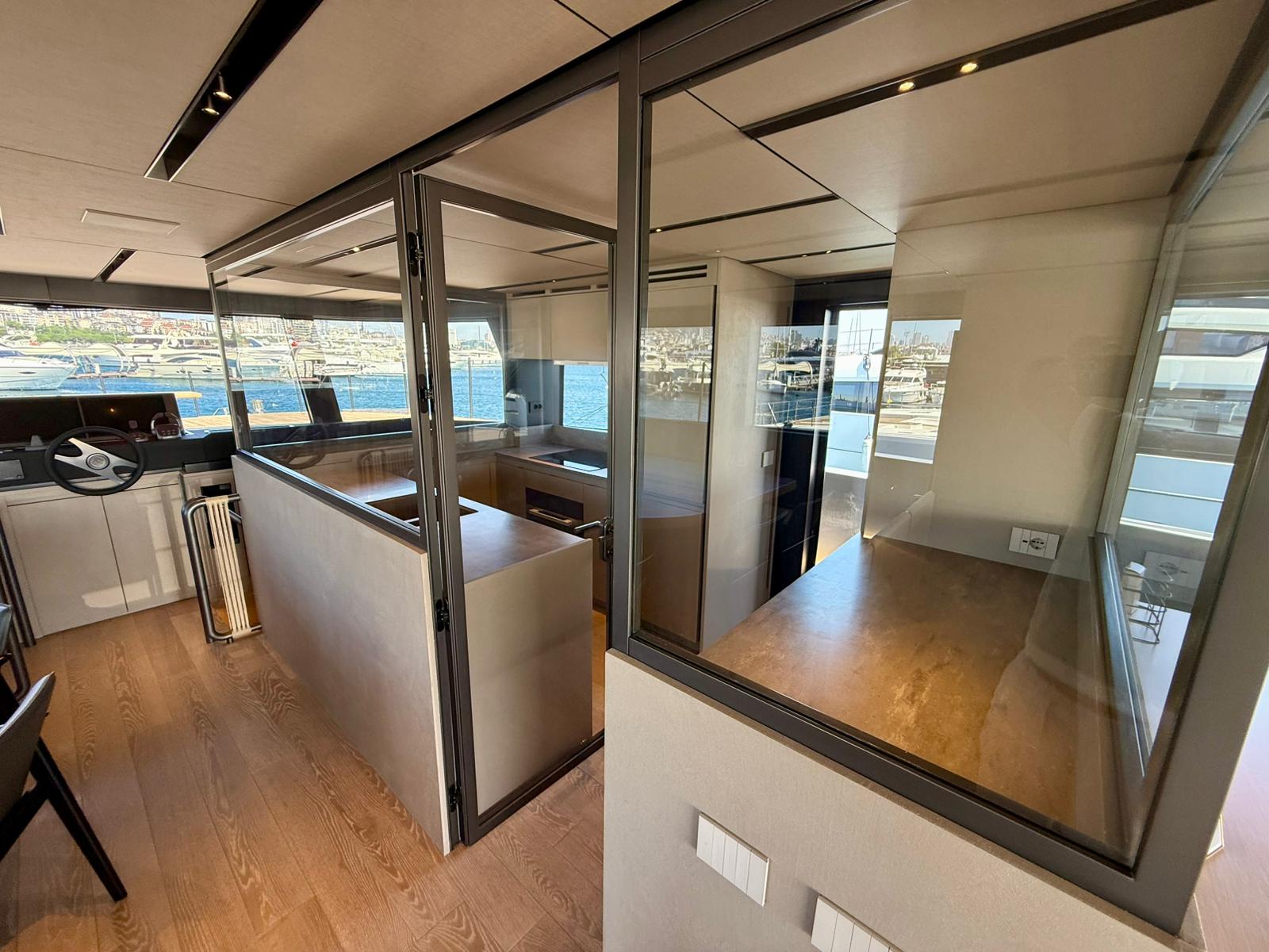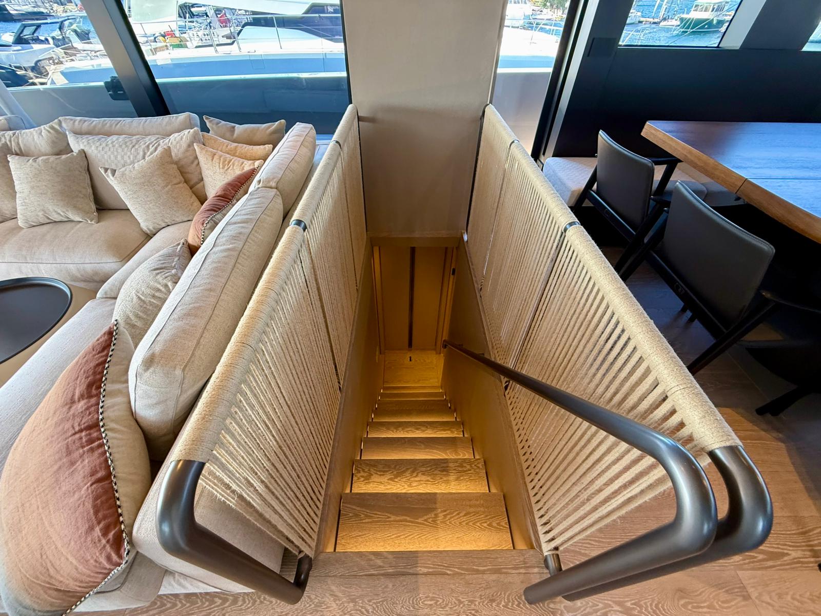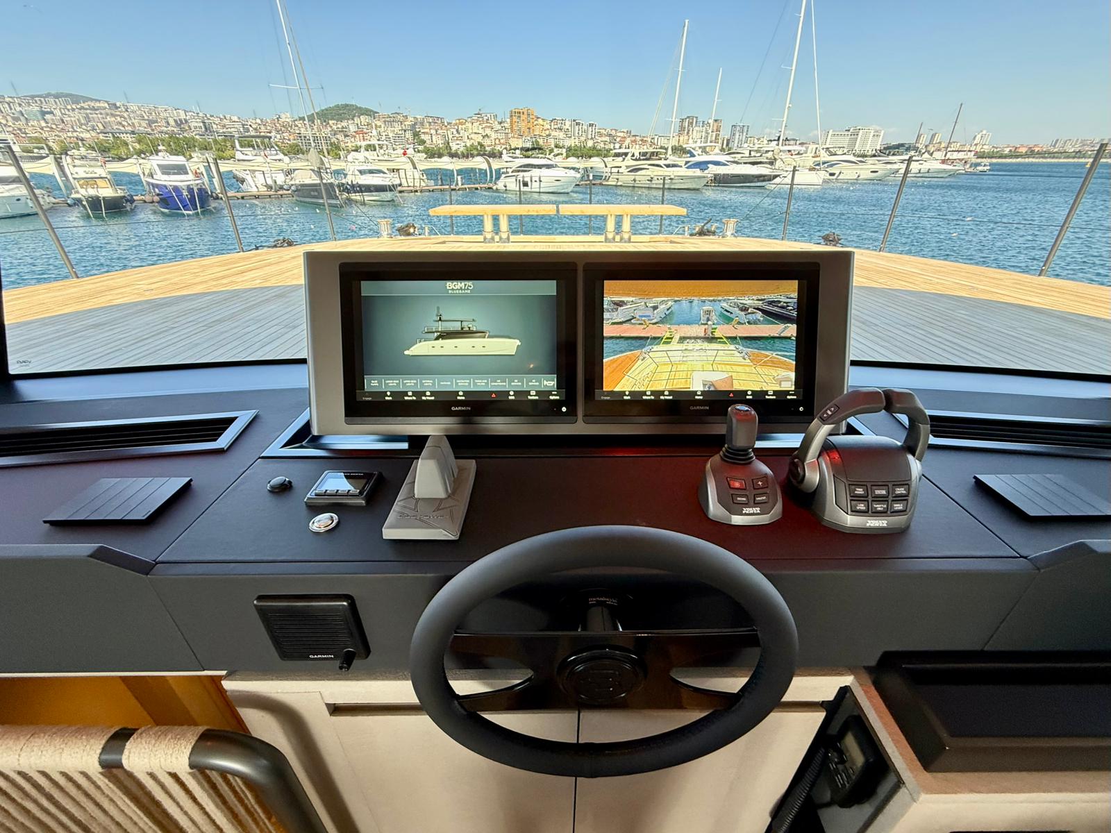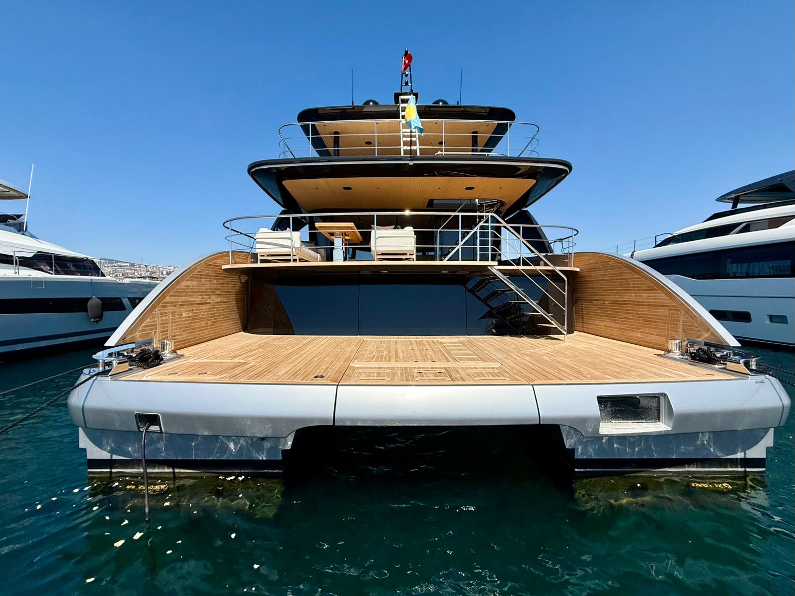 This layout is not possible on traditional catamarans, where the two hulls are too far apart to allow the aforementioned connection and are arranged separately inside the two hulls. Also viewed from the stern, thanks to the length-to-width ratio, the BGM75 is not comparable to traditional catamarans, where the two hulls are visibly separated. The aesthetic impact is of an elegant and balanced monohull and the space between the two hulls normally unused on traditional catamarans, conceals a garage for the tender, whose descent into the water is fully automated. The reduced width also allows the BGM75 to be moored between monohull boats and not between much larger superyachts, due to the disproportionate ratio between width and length.