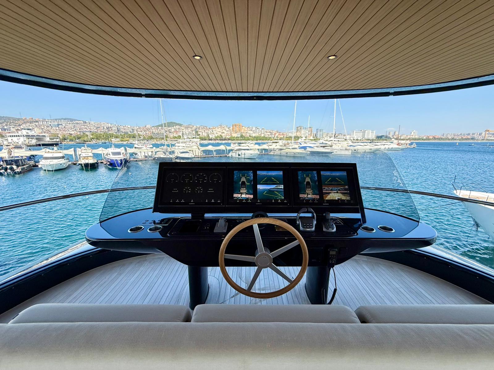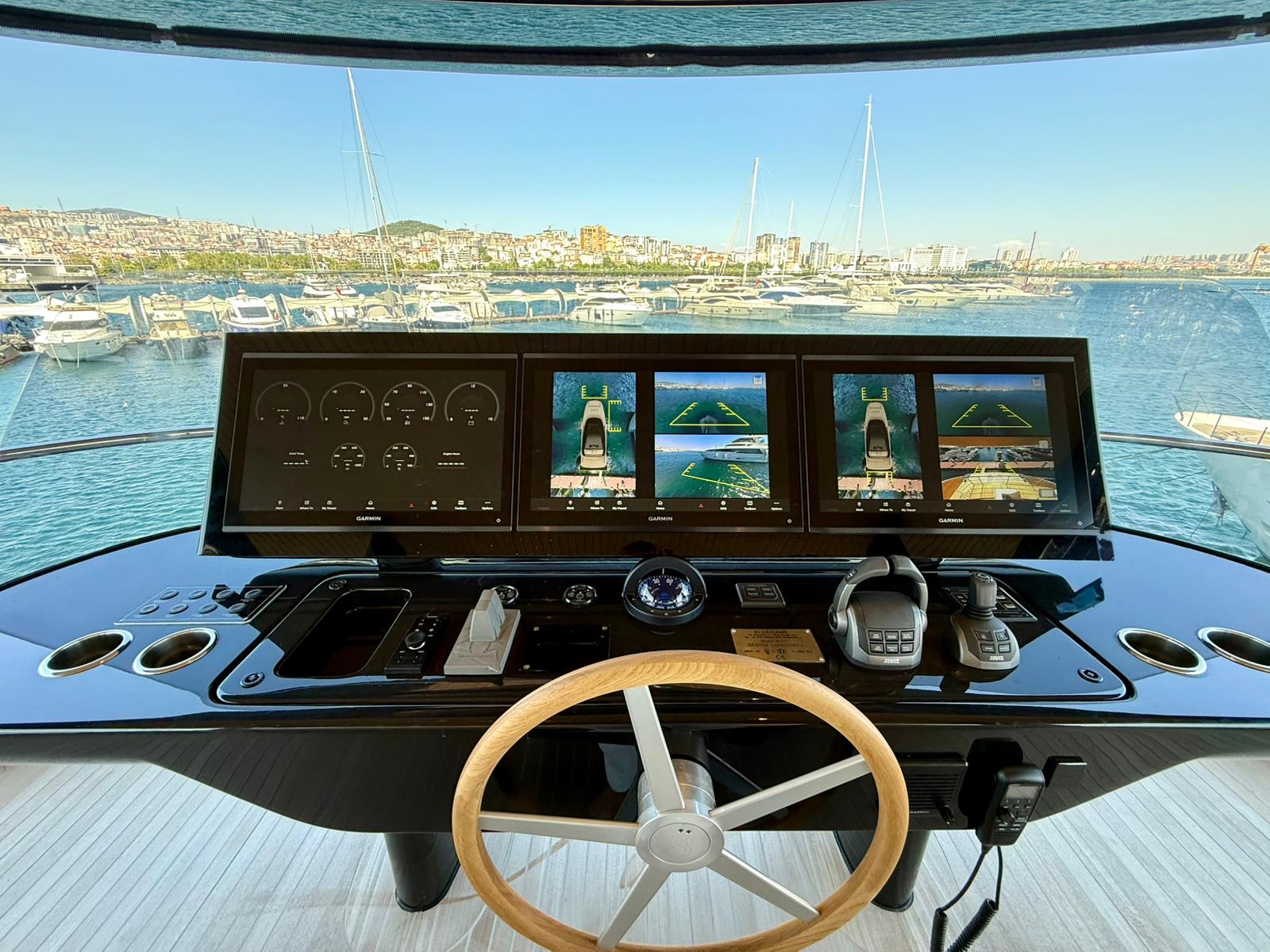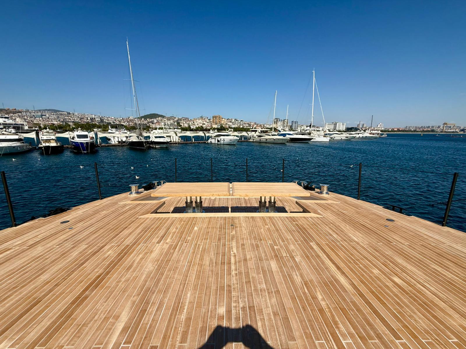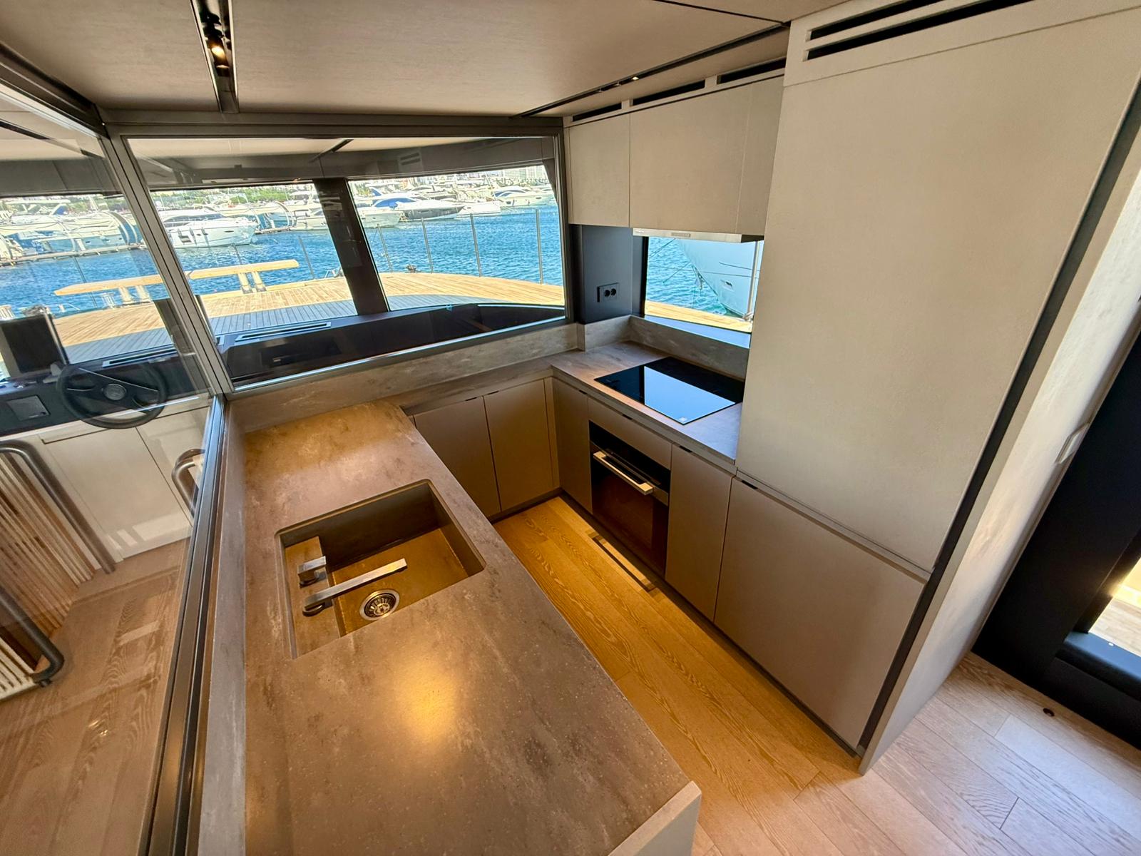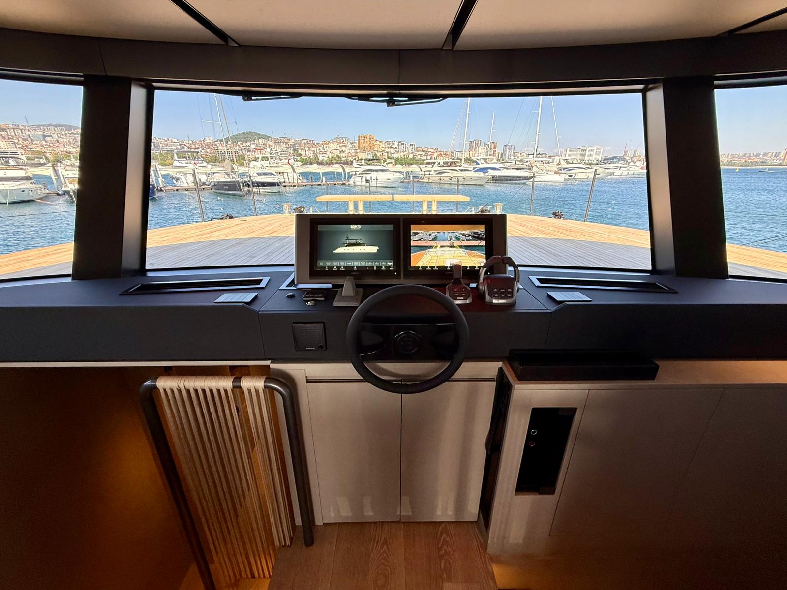 This layout is not possible on traditional catamarans, where the two hulls are too far apart to allow the aforementioned connection and are arranged separately inside the two hulls. Also viewed from the stern, thanks to the length-to-width ratio, the BGM75 is not comparable to traditional catamarans, where the two hulls are visibly separated. The aesthetic impact is of an elegant and balanced monohull and the space between the two hulls normally unused on traditional catamarans, conceals a garage for the tender, whose descent into the water is fully automated. The reduced width also allows the BGM75 to be moored between monohull boats and not between much larger superyachts, due to the disproportionate ratio between width and length.