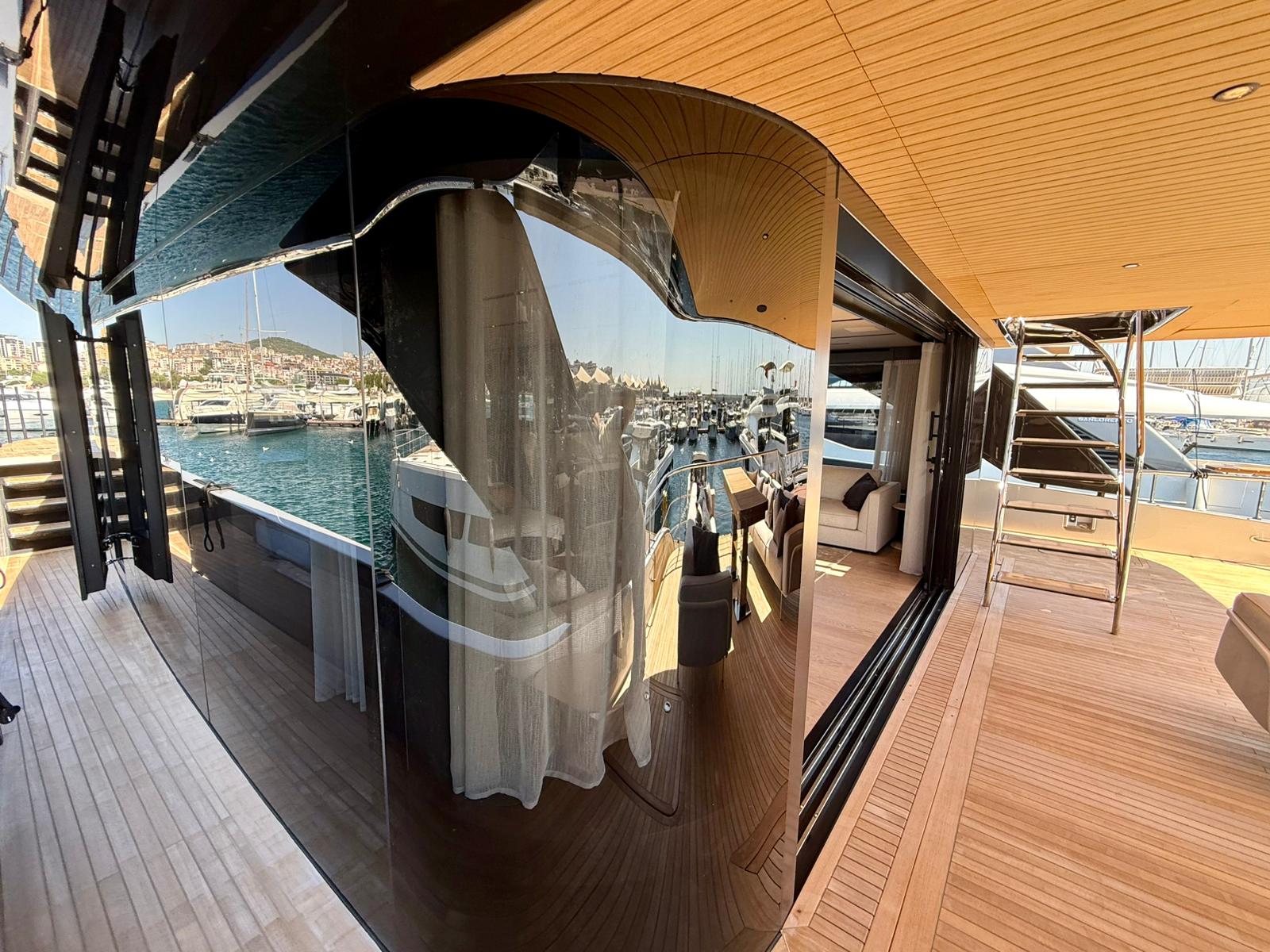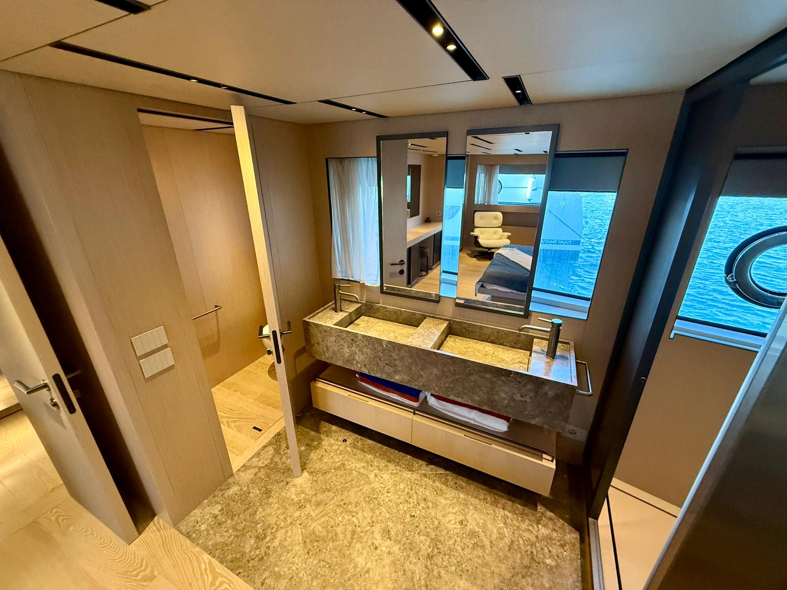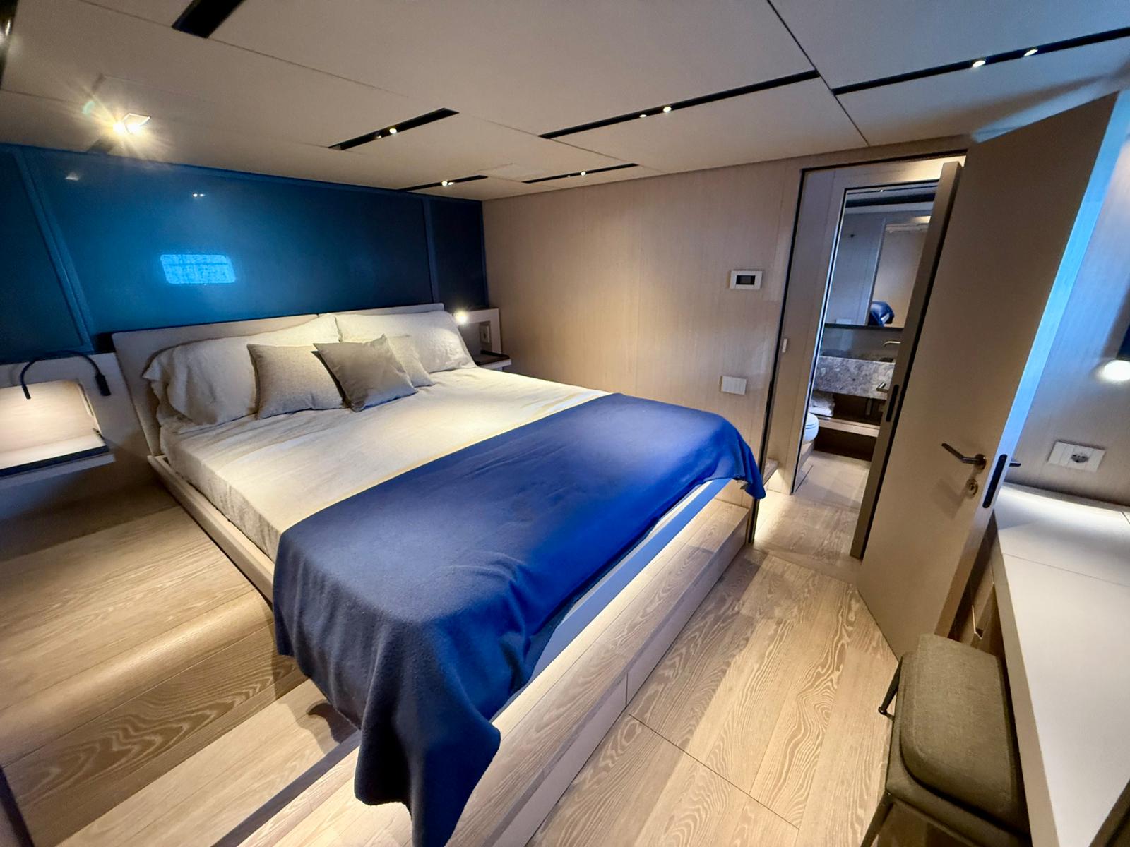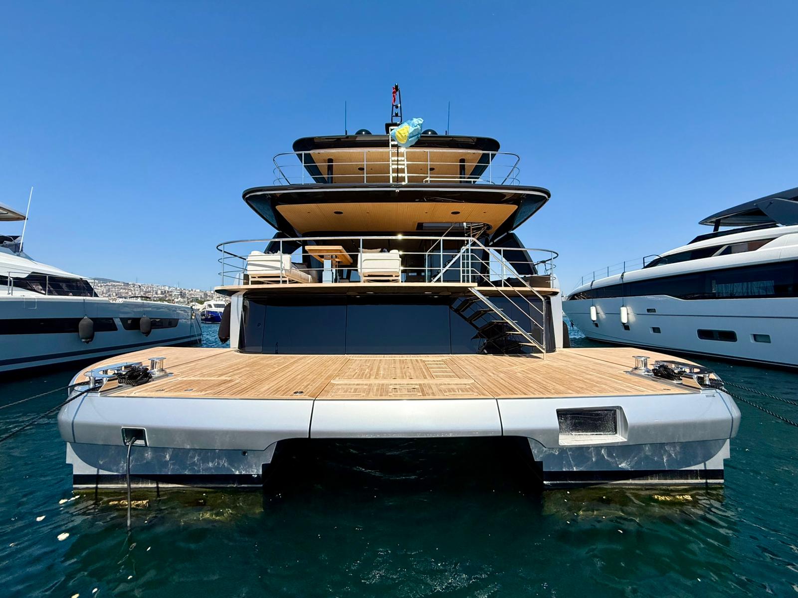 Consistent with the Sanlorenzo Group’s positioning, she is first and foremost a luxurious, beautiful motor yacht that “by chance” has not one hull, but two. Not even in this last feature, though, it can be compared to any existing catamaran on the market. Primarily because, from the first glance, the shape of the boat moves away from the “boxy” shape of a catamaran, thanks to the reduced width in favour of a ratio between beam and length closer to a monohull. This allows for the horizontal surfaces between the two hulls to connect creating a single volume as if it were a monohull; but with larger spaces and the possibility of having a full beam owner’s cabin of extraordinary dimensions.