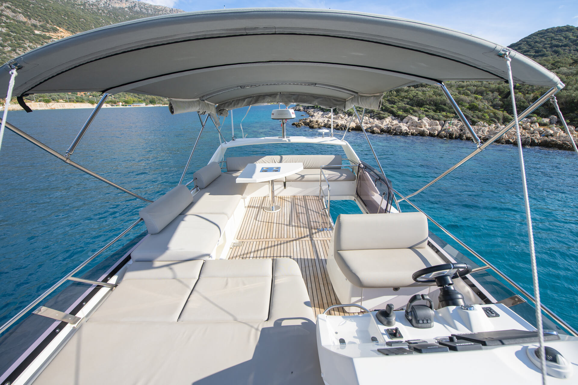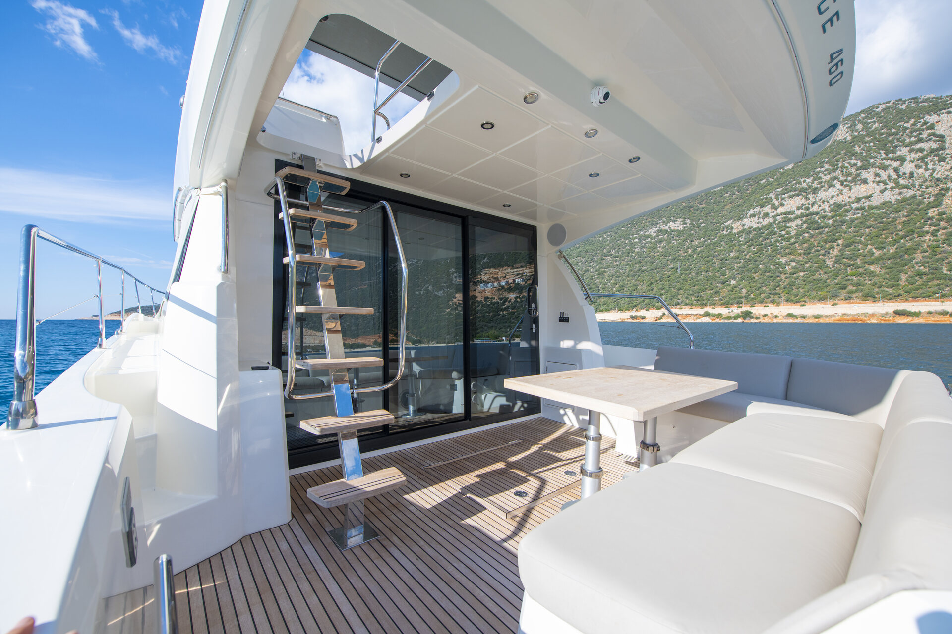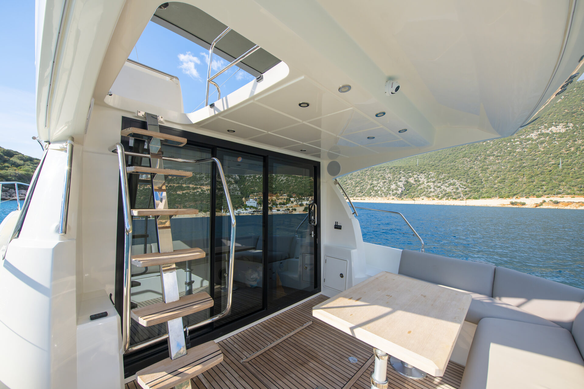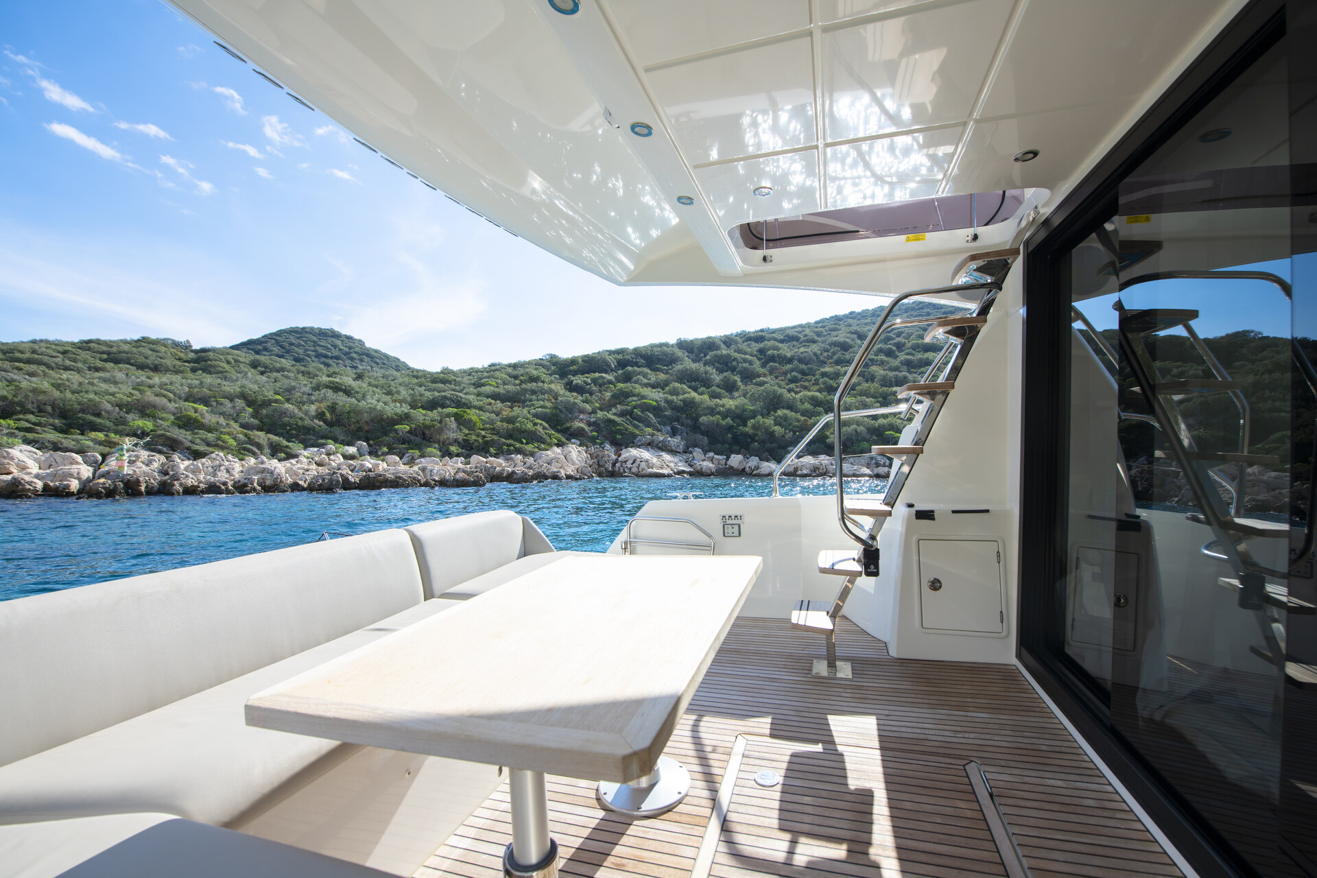 The contemporary layout of the exterior galley located to the aft opens onto an immense swim platform. The very comfortable Flybridge is an invitation to complete relaxation.