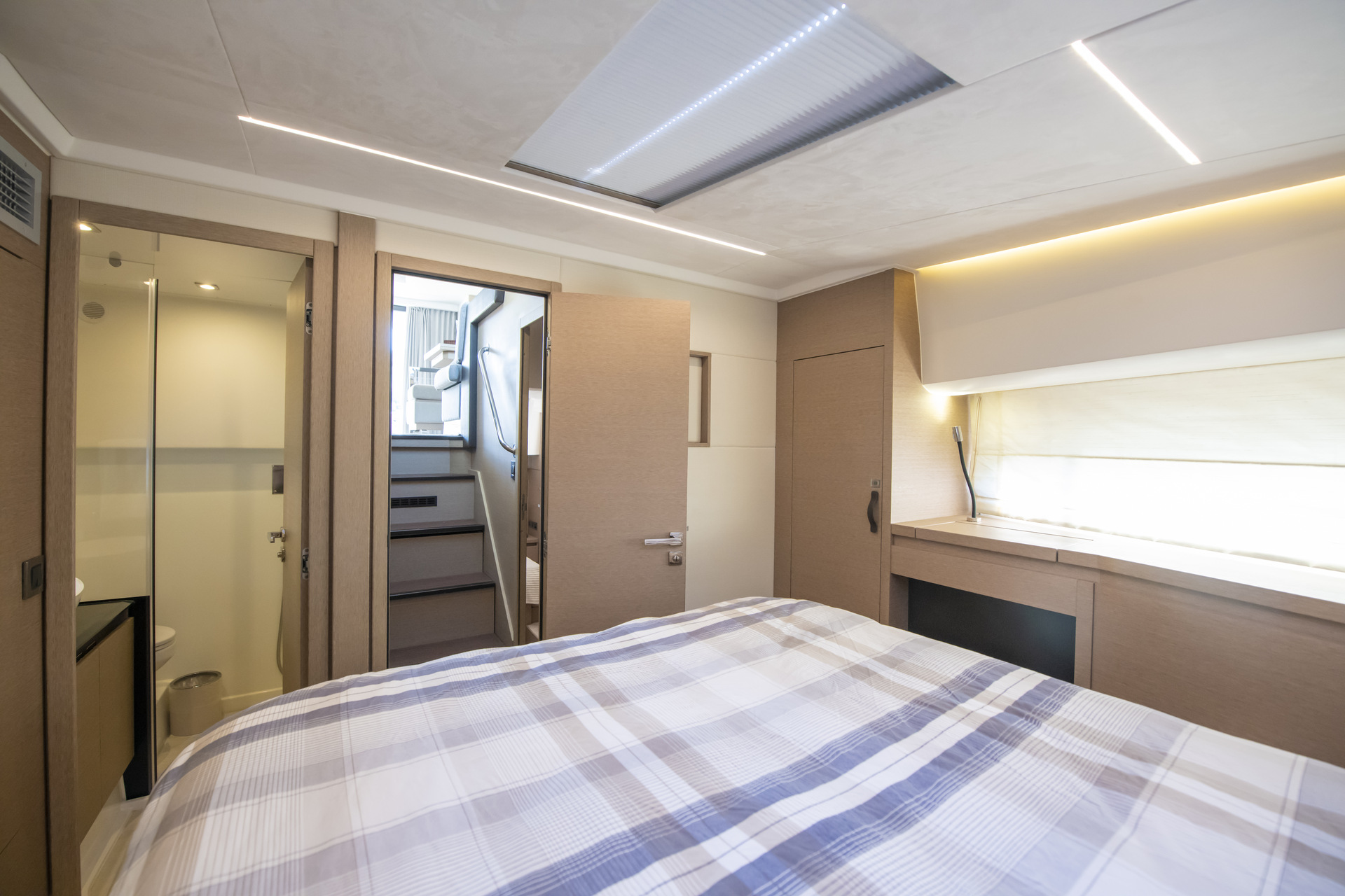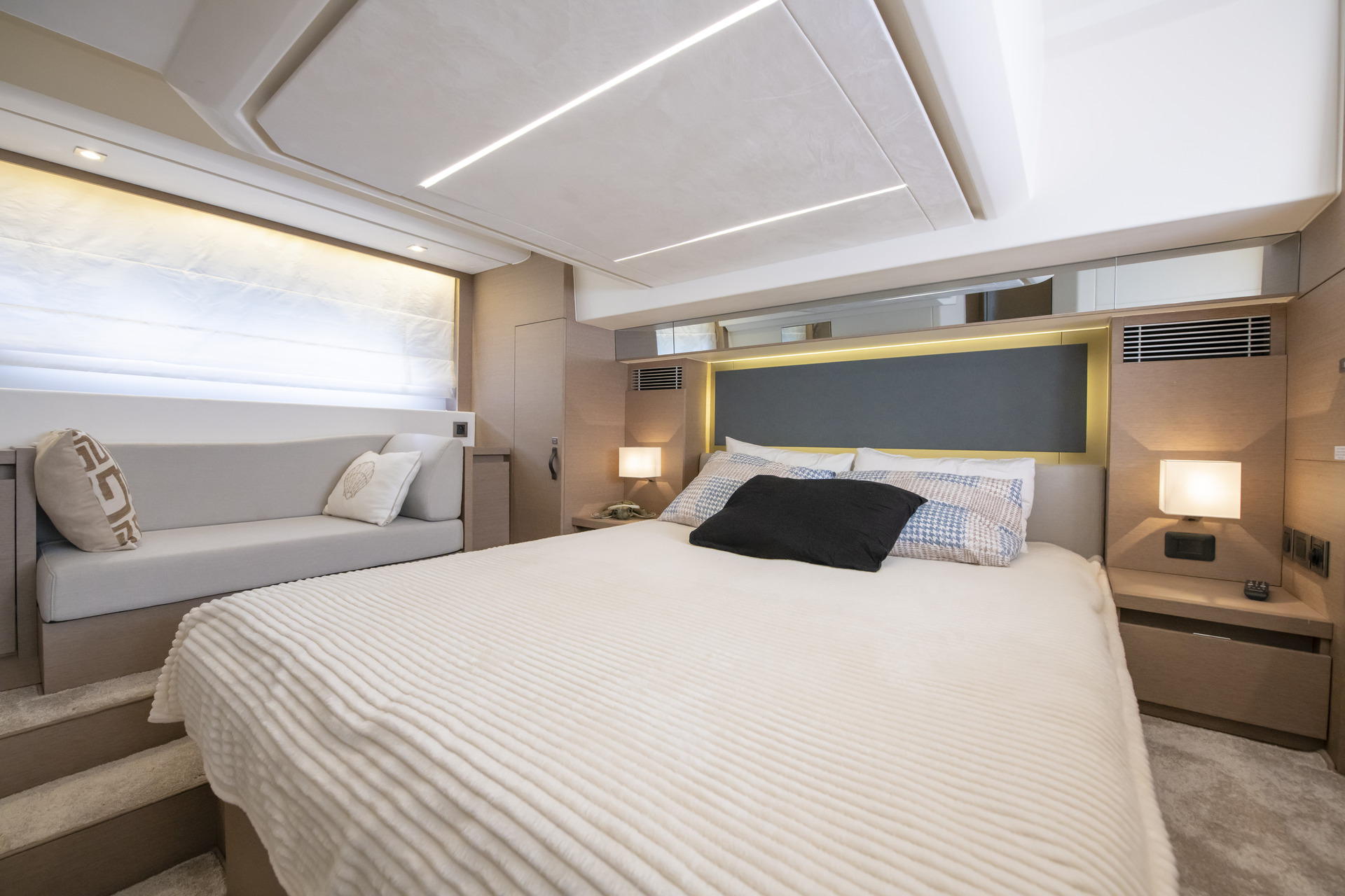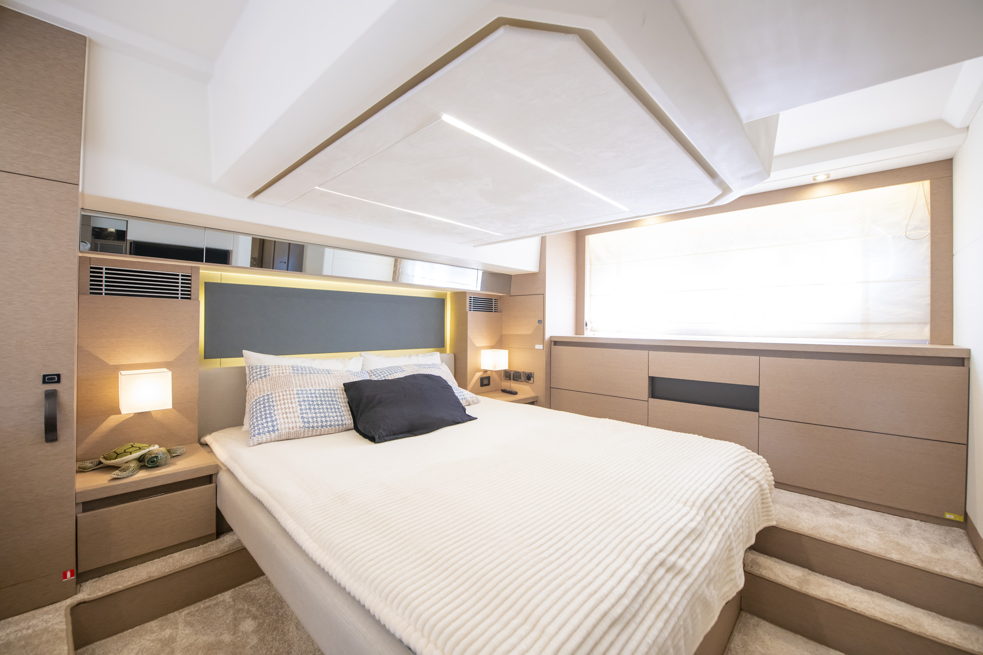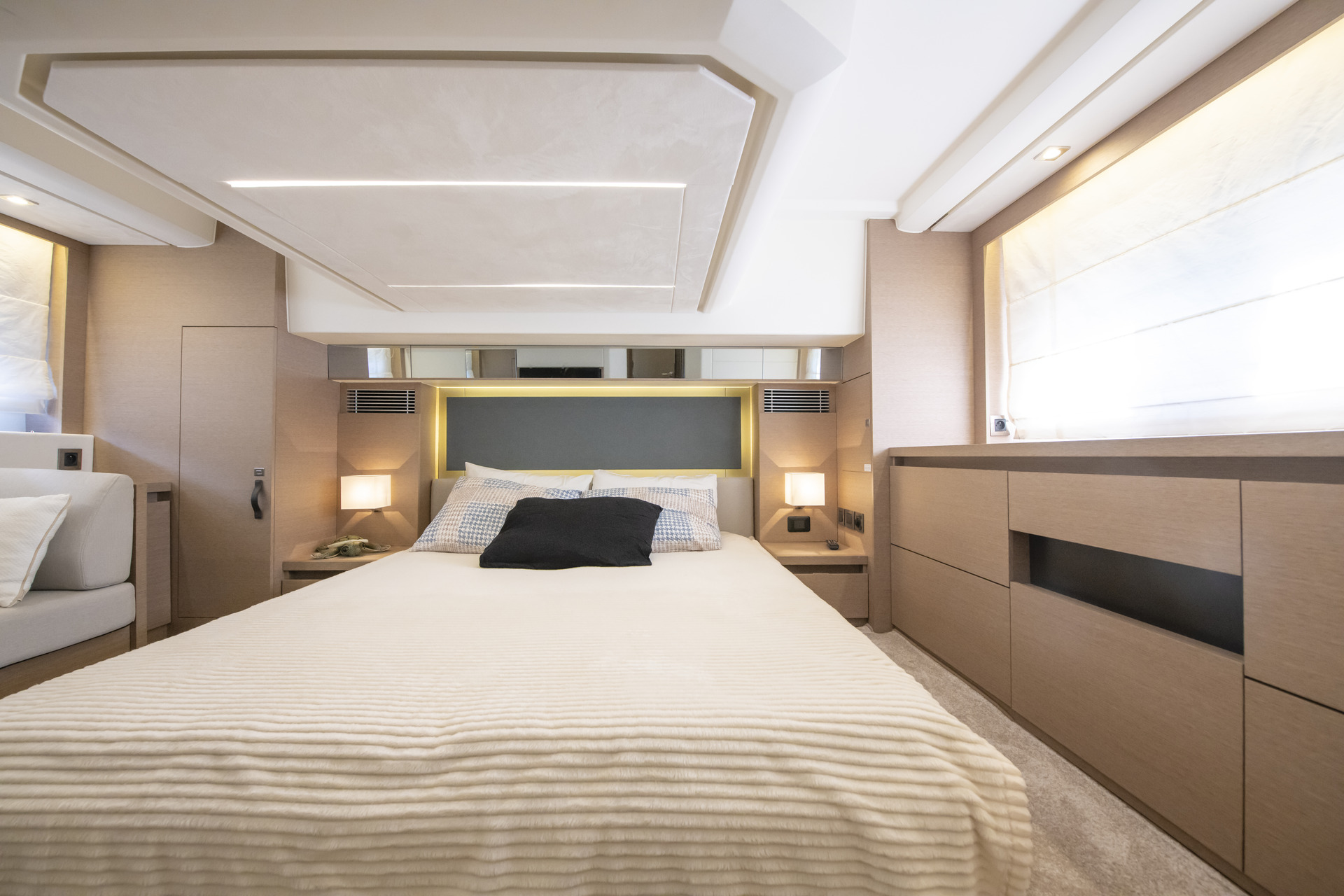 On the exterior, she features the signature style of the latest PRESTIGE Yachts, with an expanded, continuous line of windows in the hull. This Flybridge integrates the concept of the L-shaped cockpit, which allows for maximum use of space. Transformable into a very large aft sundeck, this cockpit can also house a fully equipped skipper cabin.