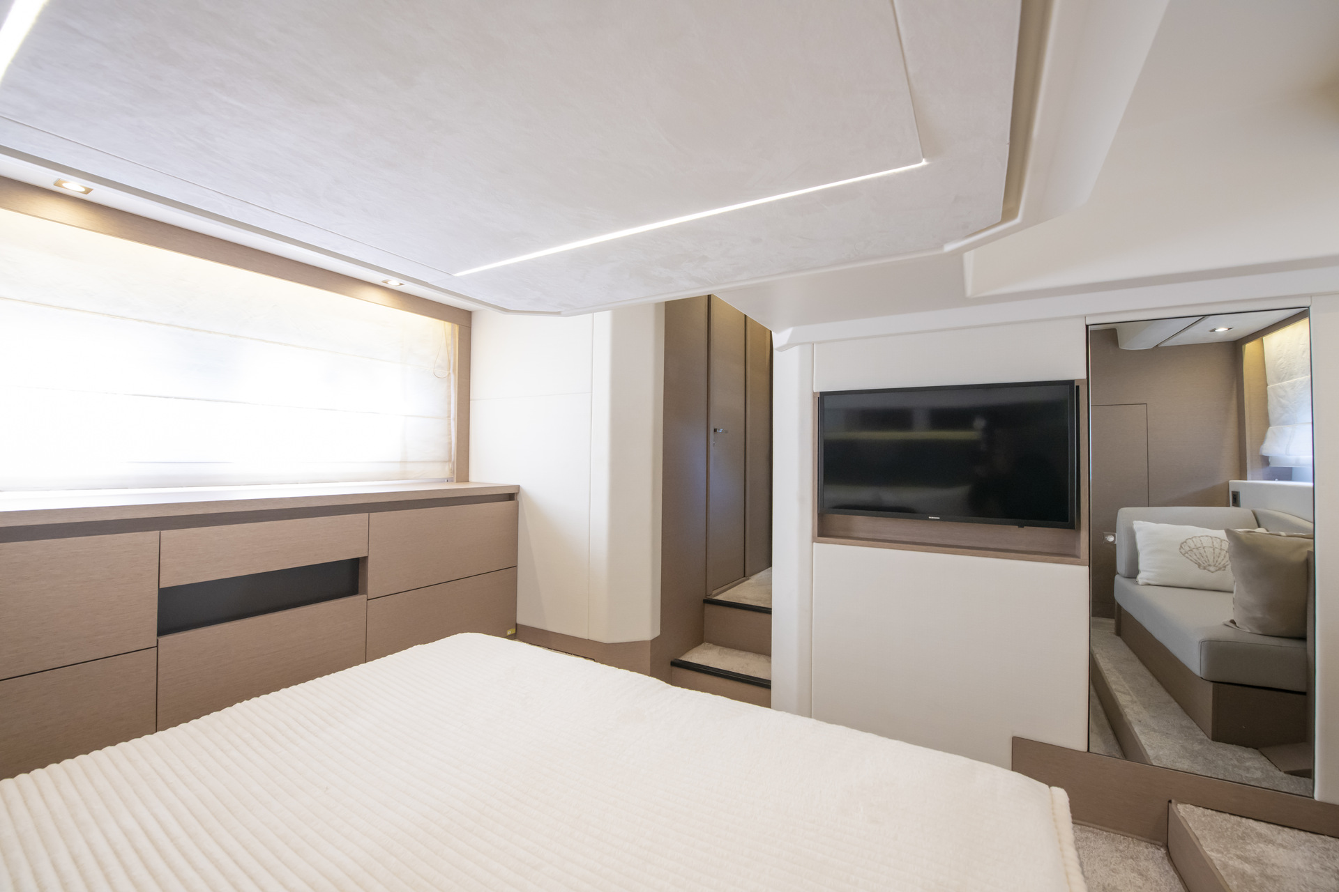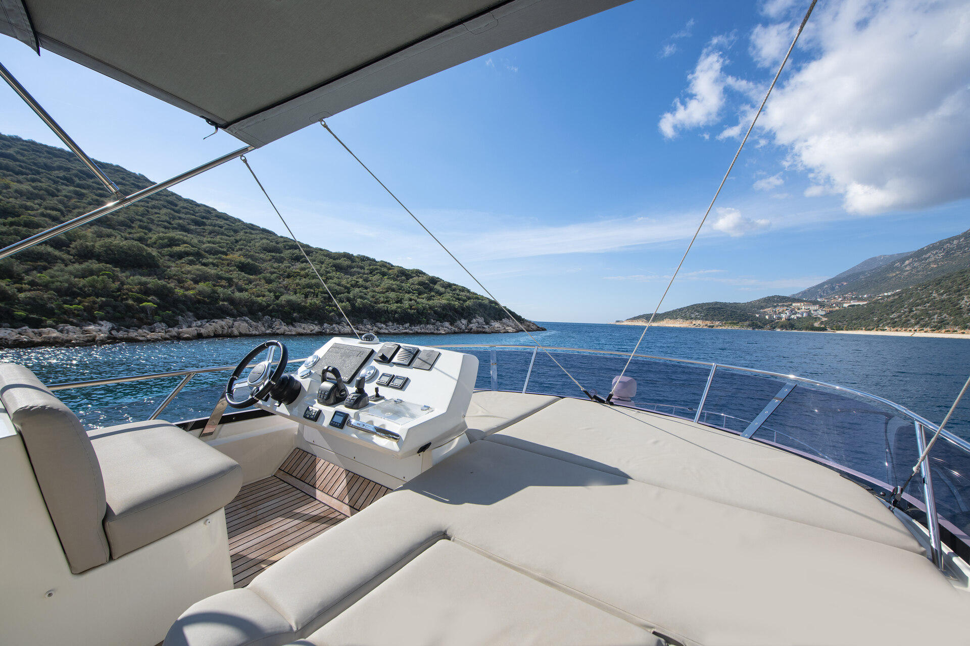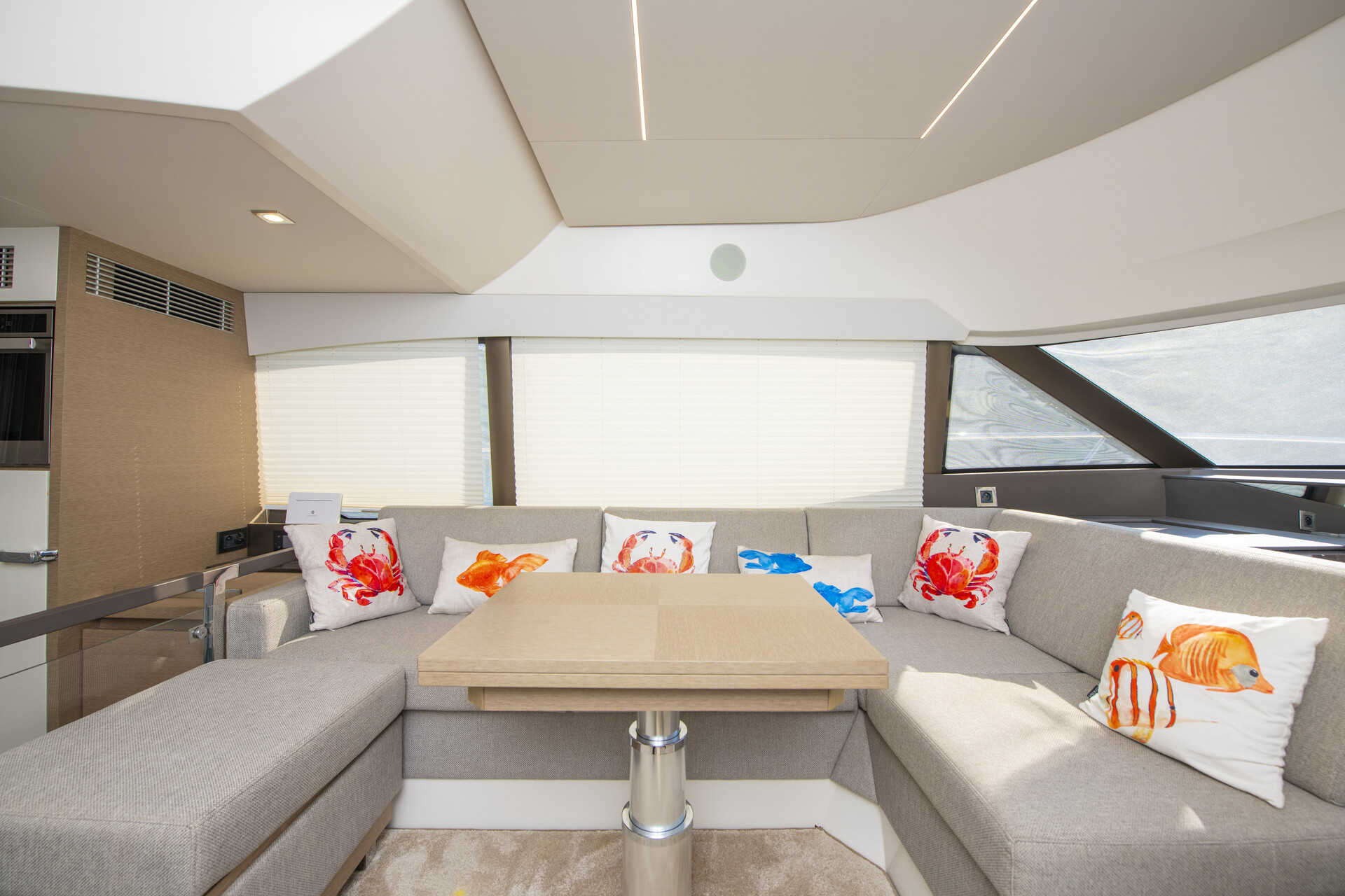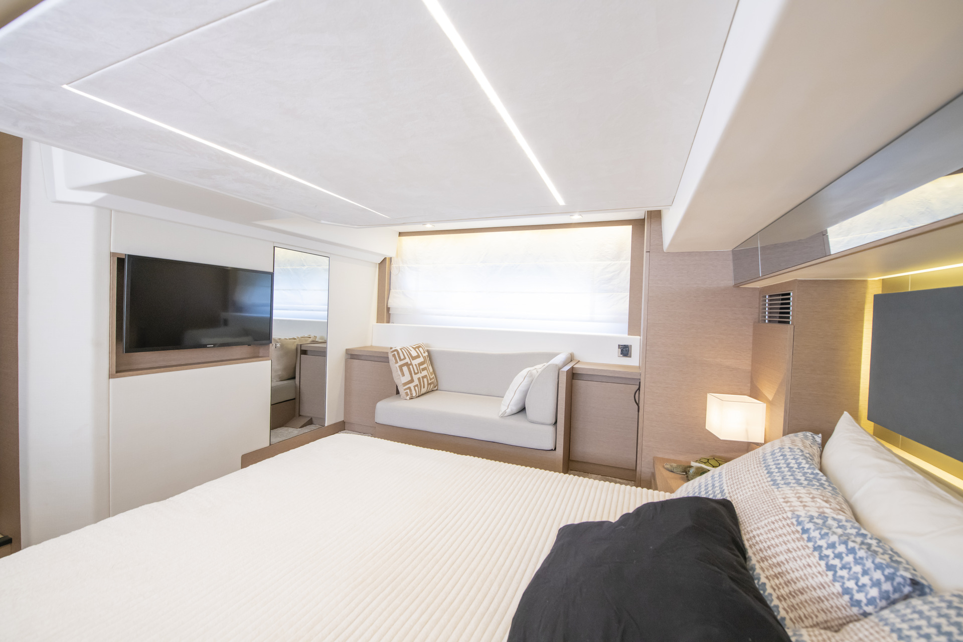 On the exterior, she features the signature style of the latest PRESTIGE Yachts, with an expanded, continuous line of windows in the hull. This Flybridge integrates the concept of the L-shaped cockpit, which allows for maximum use of space. Transformable into a very large aft sundeck, this cockpit can also house a fully equipped skipper cabin.