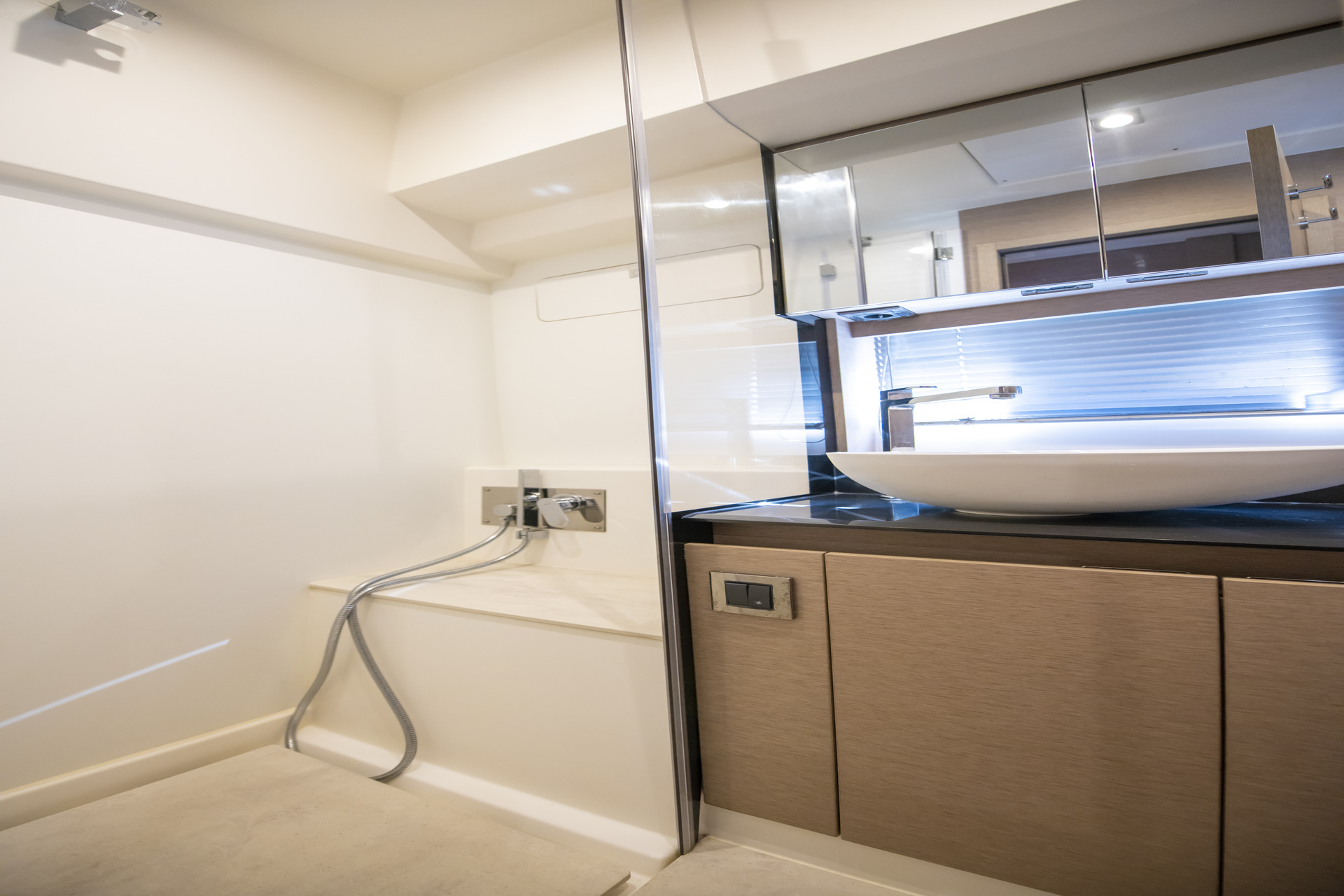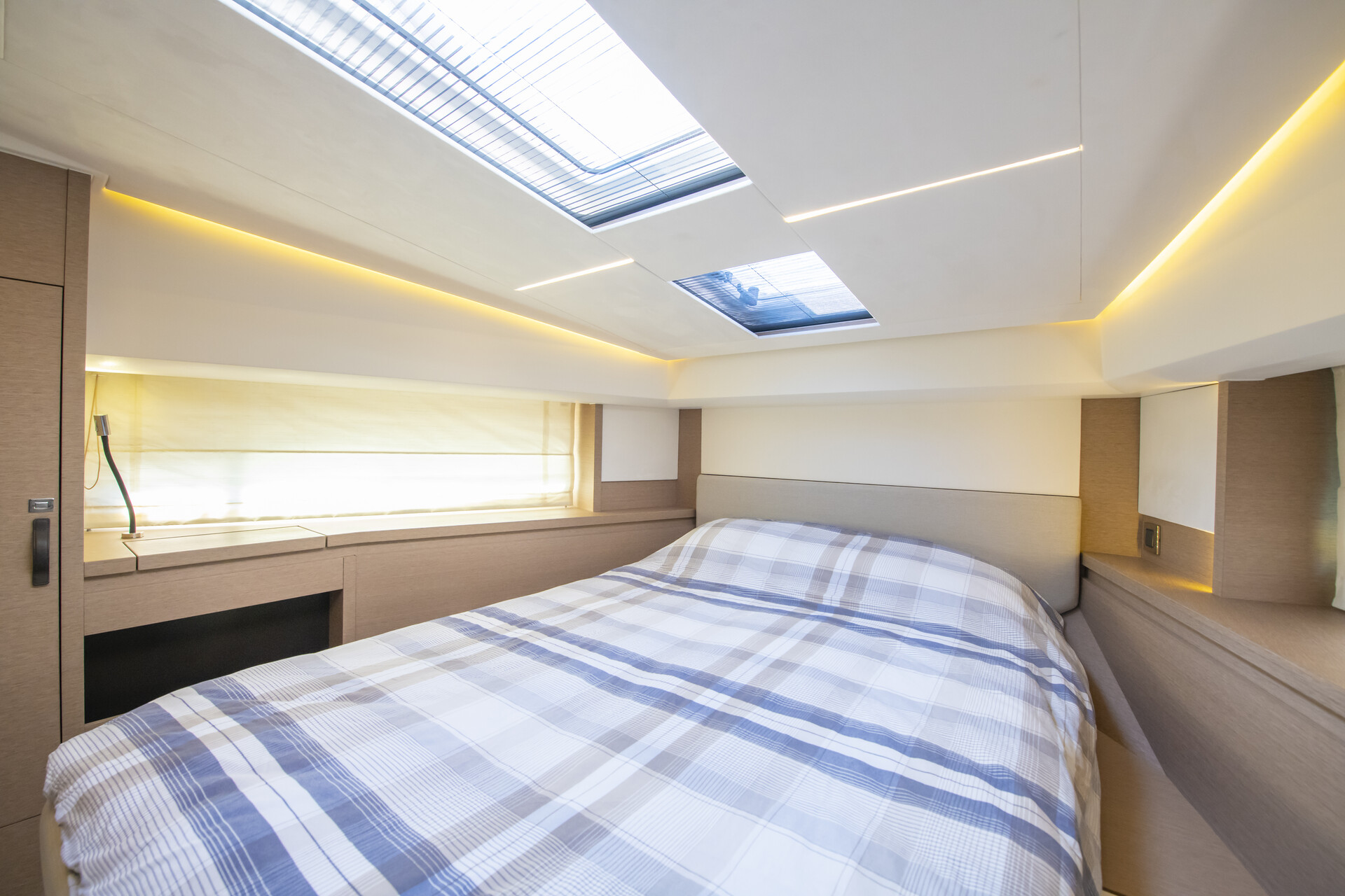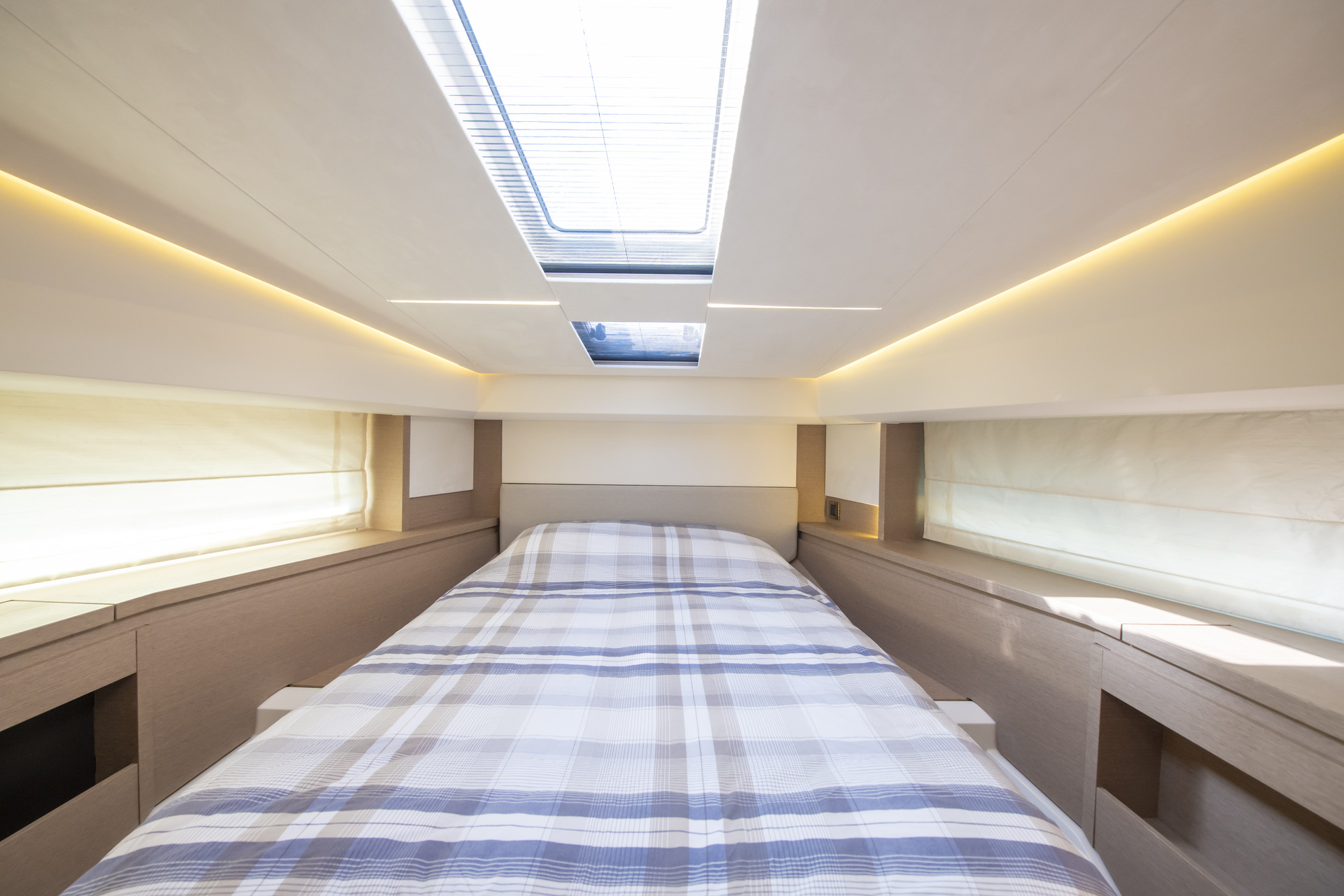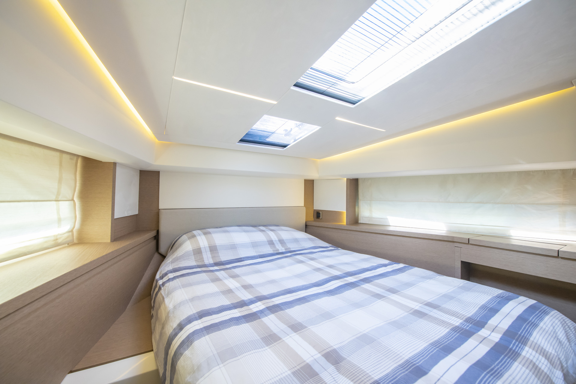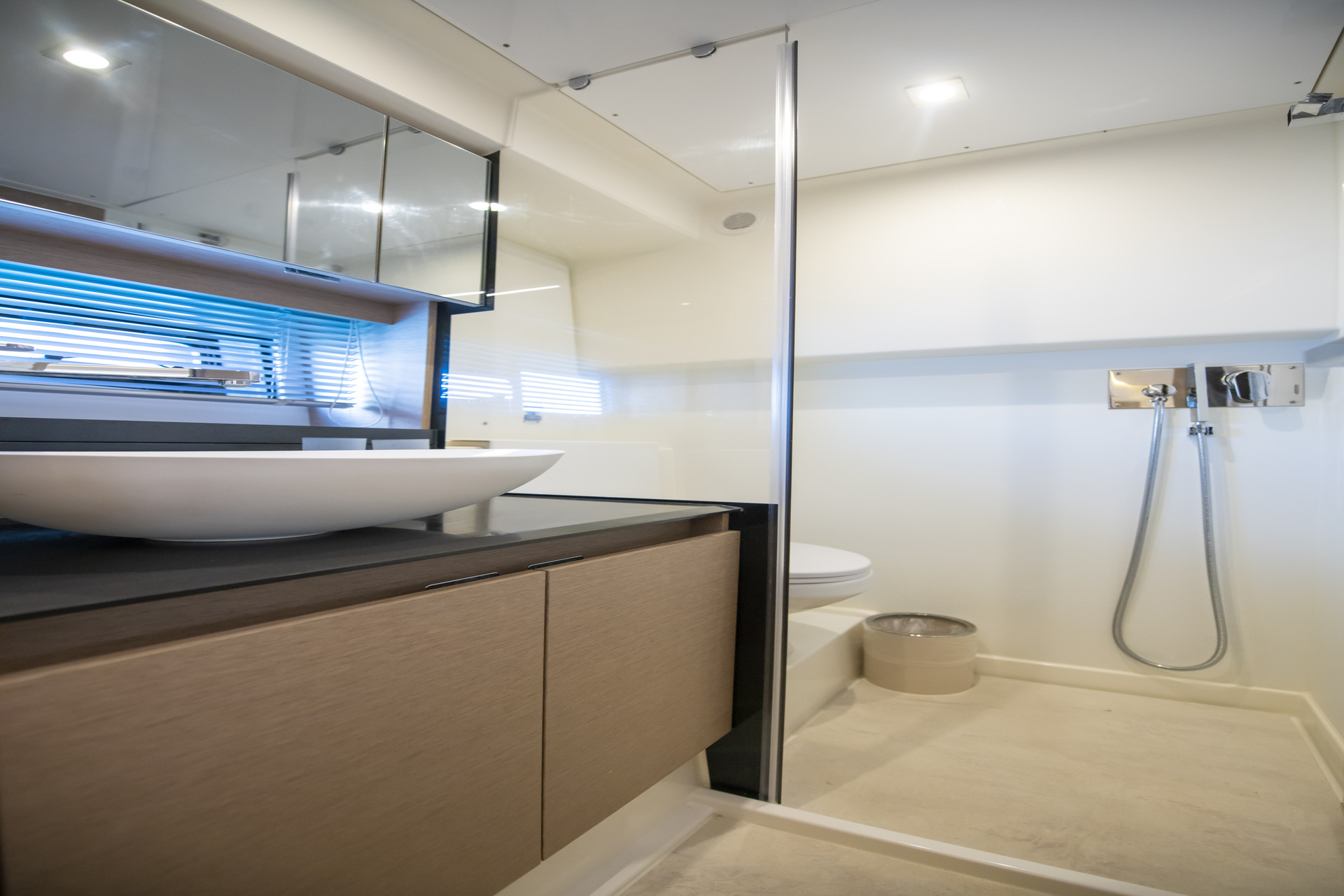 On the exterior, she features the signature style of the latest PRESTIGE Yachts, with an expanded, continuous line of windows in the hull. This Flybridge integrates the concept of the L-shaped cockpit, which allows for maximum use of space. Transformable into a very large aft sundeck, this cockpit can also house a fully equipped skipper cabin.
