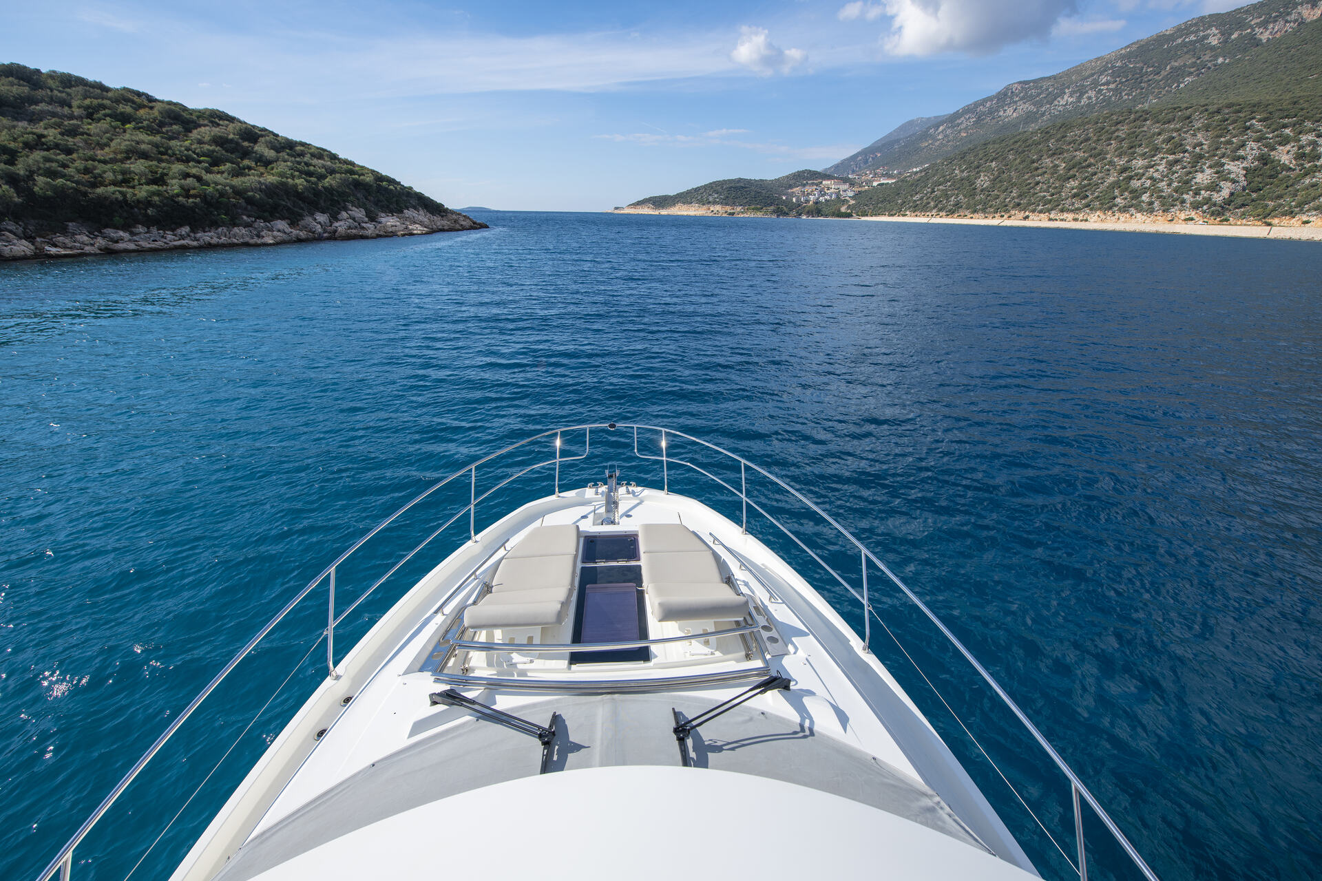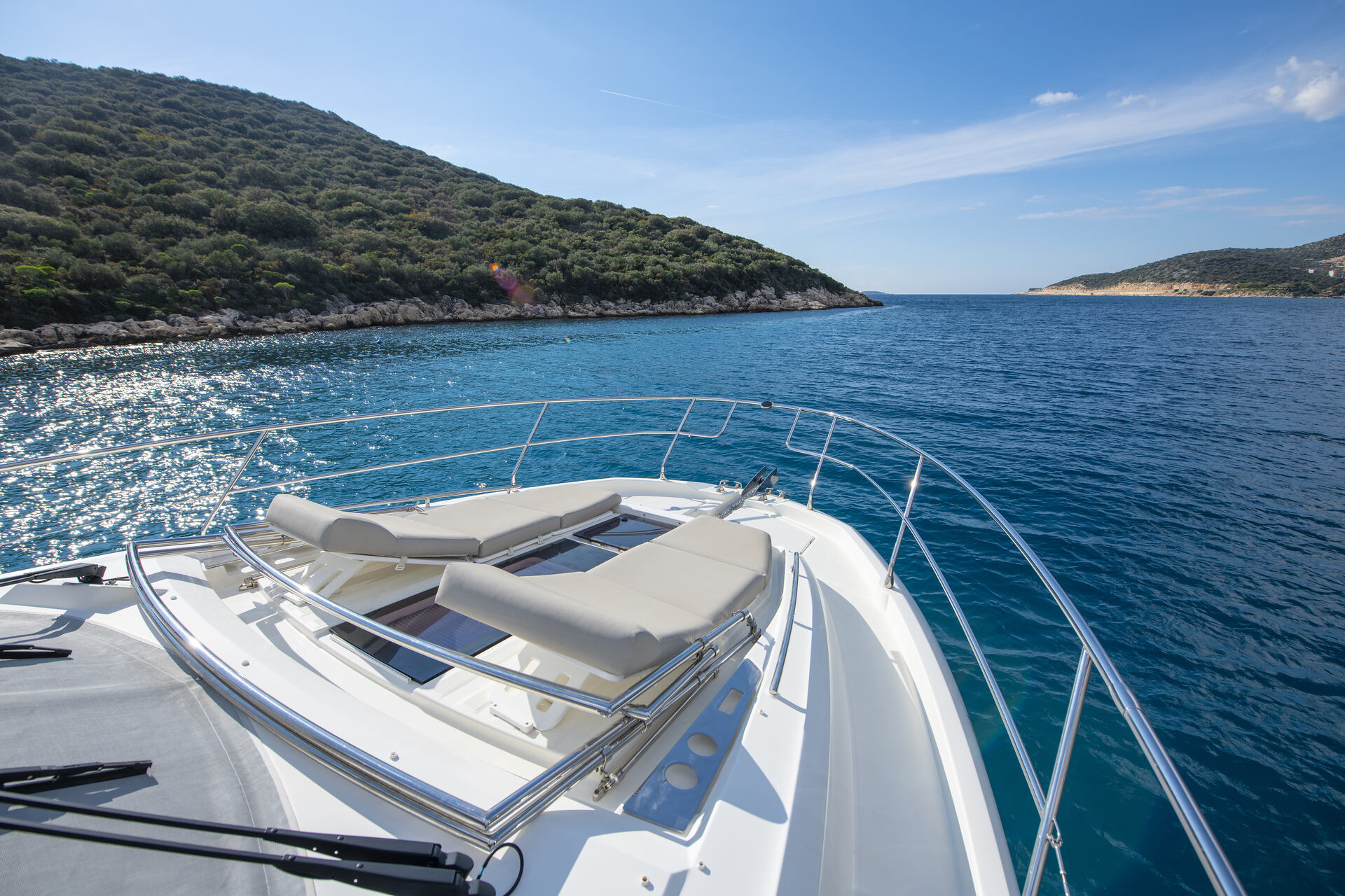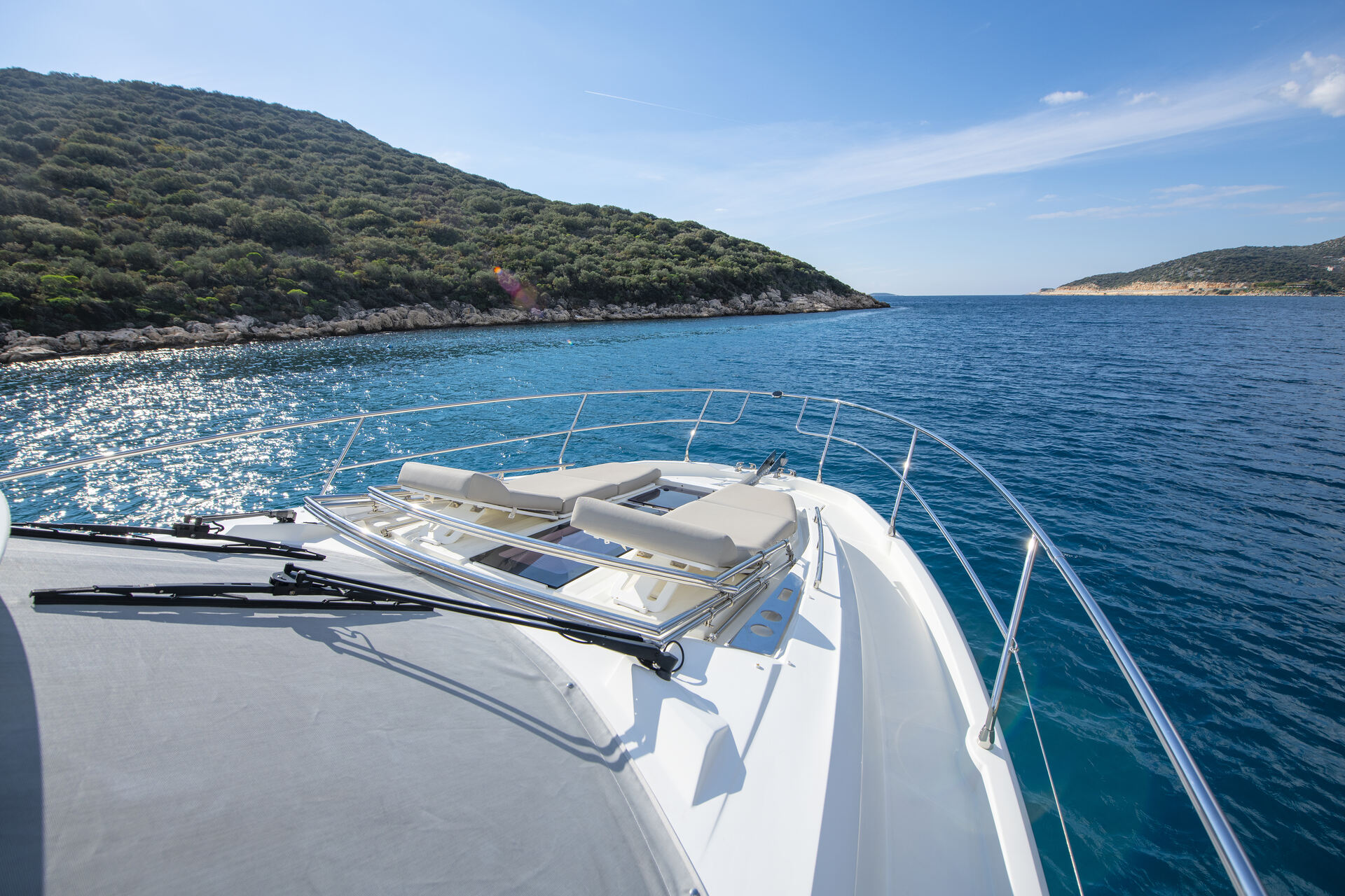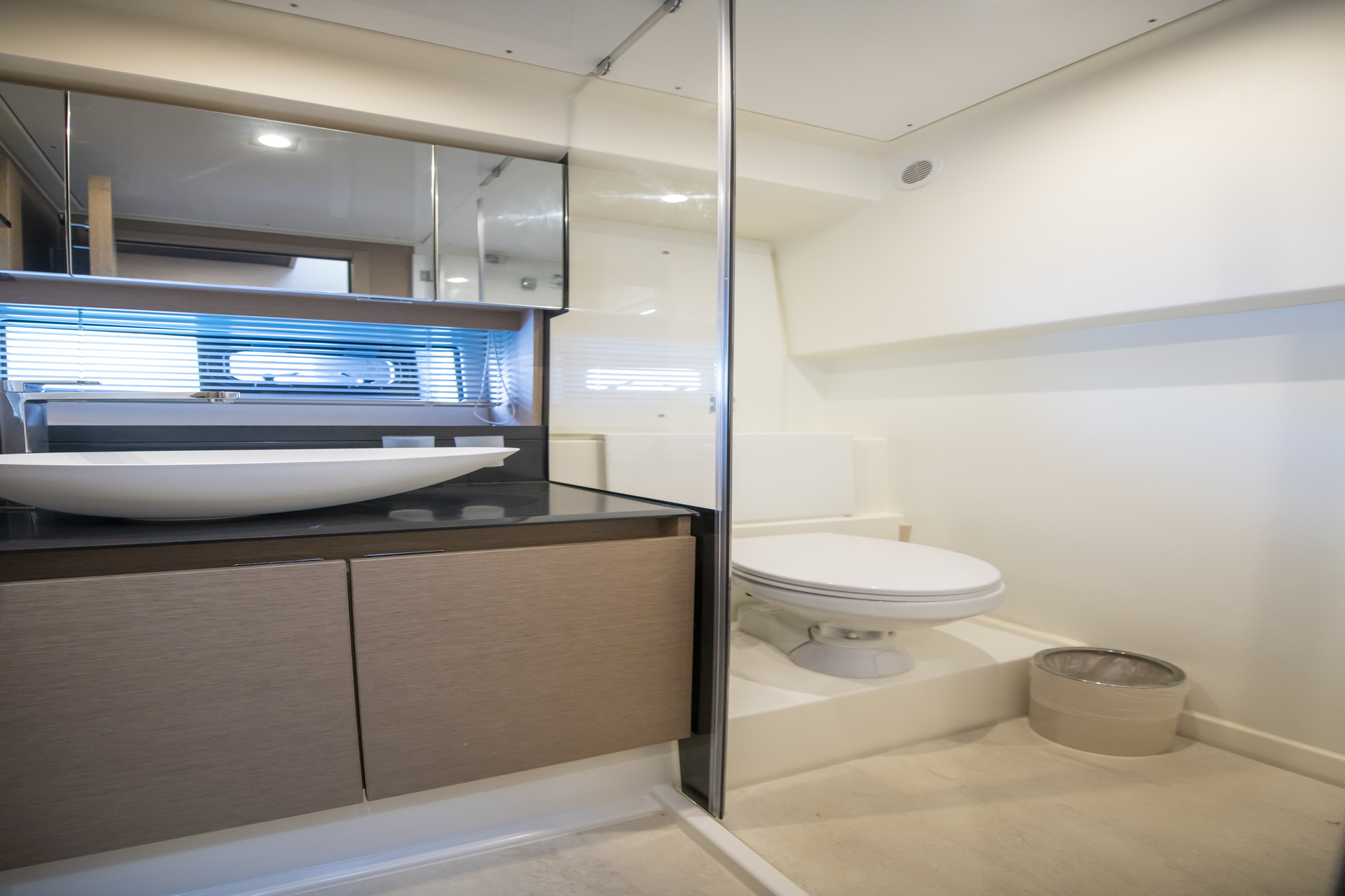 On the exterior, she features the signature style of the latest PRESTIGE Yachts, with an expanded, continuous line of windows in the hull. This Flybridge integrates the concept of the L-shaped cockpit, which allows for maximum use of space. Transformable into a very large aft sundeck, this cockpit can also house a fully equipped skipper cabin.